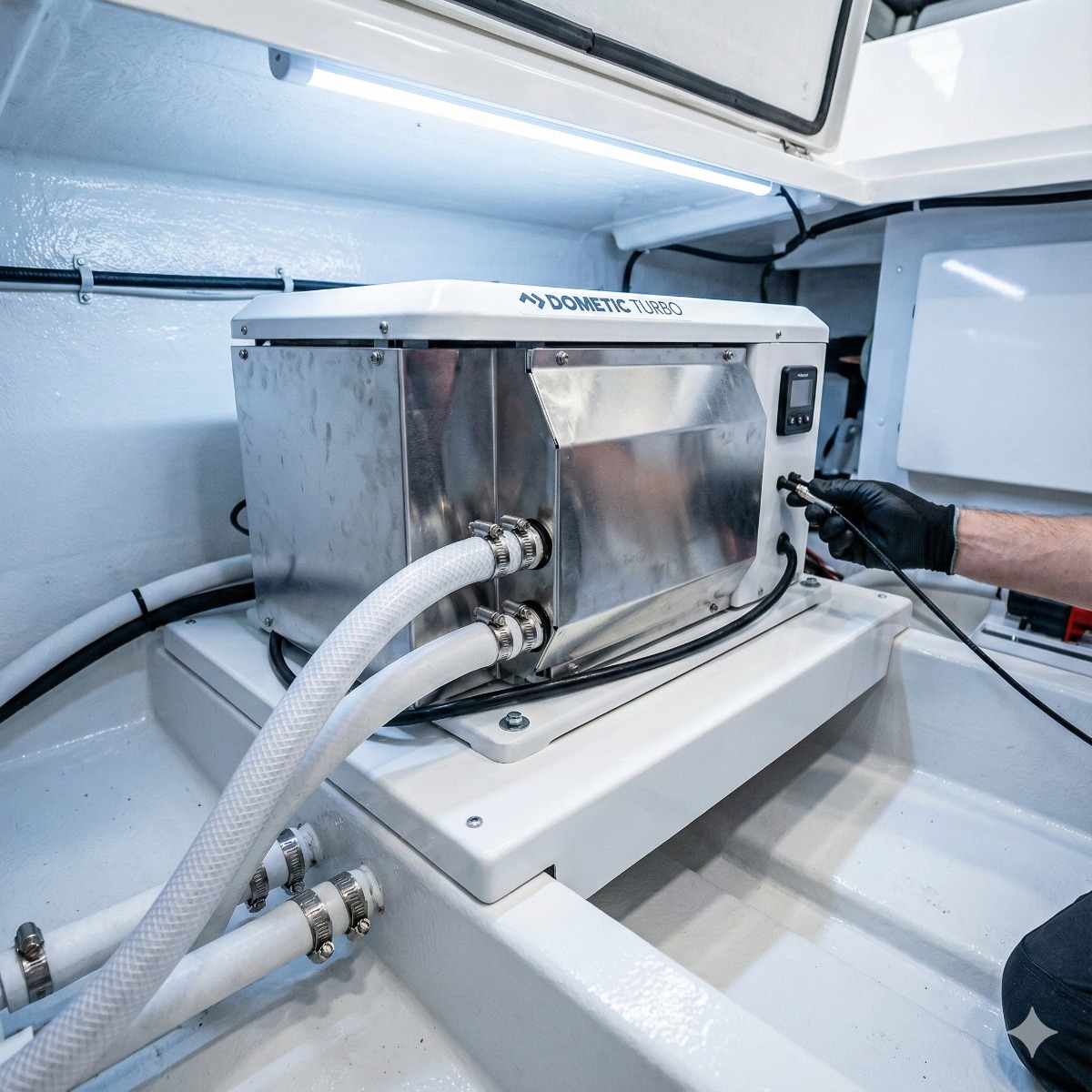 We carefully extract the old unit, capping off electrical and plumbing lines to ensure no saltwater spills into your bilge or carpet.